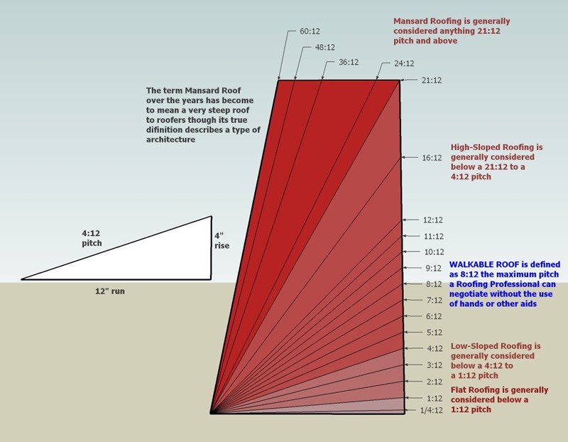 The slope or pitch of a roof is described in ( a number : 12) so a 7:12 means for every 12″ in run it rises 7″ in elevation.