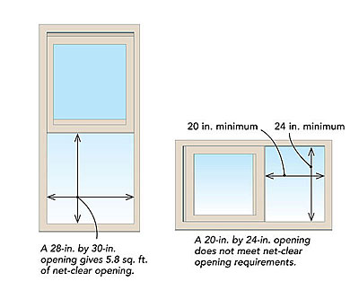 In addition to the net-clear opening, there are also requirements for sill height, as shown in the drawing. For an egress window in a below-grade basement, a window well with ladders or steps is required. (under certain circumstances)