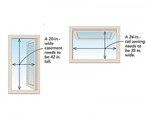 The opening offered by a double-hung window or a horizontal sliding window would be slightly less than half of the total pane area if the window were fully operable. A casement window offers almost the entire pane area: the most egress for the size of the window. Awning windows are trickier because they often don’t open as wide as casements (if they opened all the way, they’d direct rainwater into the house). Before you buy an awning window for egress purposes, make sure it will satisfy your building inspector.