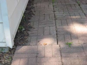 This is also a good time to look for tripping hazards like bicycles and kids toys. Fixing this situation would be fairly simple. It would involve lifting out the tiles, repacking the base gravel and repositioning the tiles.