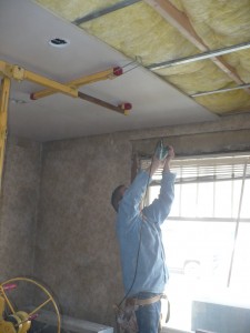In this case, sound transmissions between upper and lower apartments is the problem. There are building code requirements that address fire and sound for new construction, but this home was built in the early 1900’s. Our research turned up many products available claiming to reduce transmissions dramatically, like sound blankets and Quietrock , the materials we chose were readily available, easy to install, promised good results, and relatively inexpensive. USG